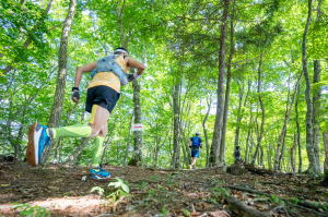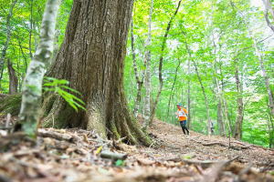 スタート会場は小菅の湯です。今年は小川壮太選手と牧野公則選手を招待してのスタートです。スタート直後に小菅川の源流であるかつての大規模ワサビ田を抜け、明治から百年以上手つかずの原生林が保存されている巨樹の森を目指します。この辺りはミズナラや栃の木が生える広葉樹の美しい森です。足元がふわふわの人気トレイルです。