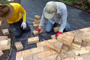 KFCの活動拠点「成木ガーデン」 にあるスウェーデン小屋横のバオバブの木と成木の家正面玄関にある成木ガーデンの看板の足元に耐火レンガを敷き詰めました。これで雑草を抑えることができ、また、見栄えも良くなりました。