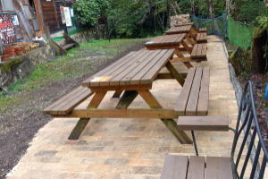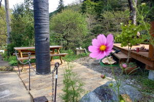 毎年、成木ガーデン裏手の成木川沿いのピクニックテーブルが一つ設置してある小さなスペースに雑草が生い茂って困っていました。草刈りをしてもすぐに雑草が生えてきます。そんなイタチごっこを繰り返すうちにレンガを敷こうと思い立ち、6月末に実行しました。結果、居心地の良いスペースになり、利用者に好評で、草刈りが必要なくなりました。