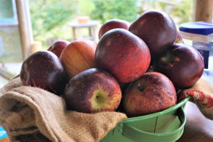 これらのりんごは信州麻績村産の「秋映」と「シナノスイート」という品種で、甘くて、酸味もあって美味しいリンゴです。 先週、我々が麻績村で借りているリンゴの木から収穫して、持ち帰ったものです。