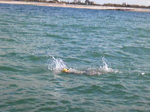 始めは4人で泳いでいたが、1時間泳いだら段々と皆との差が出てきて、私は同じようなスピードの人と泳ぐことになった。凄いラフウオーターの中を 同じ思いをしながら二人で泳ぐ。たまに息継ぎしながら目と目を合わせ確認する。ラフが得意な私は少し前気味にリードしながら一生懸命泳ぐ。何だか1時 間のインターバルを6本やる感じだ。しかしイーブンペースで終える事が出来た。