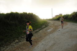 思った通り、予定時間の6時30分を5分ぐらい過ぎたところでスタート。 まずは山のふもとまでしばらく舗装路が続きます。日の出とともに、だんだん明るくなって来ました。 3qぐらいのところで、まず最初のエイド。 なにが嬉しいと言って、エイドほど嬉しいものはない。 小さな子が、すごい不機嫌な顔で座っていたのが印象的。