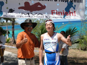 今年は3月中頃、サイパン〜テニアン間を結んでいるフェリー船が急きょ運航中止になったと連絡が入った。大量に人や物を運べる のはこのフェリー船以外になく、残るアクセス手段はセスナ機のみである。一時は中止も考えたが、テニアンの海は捨て難いものがあり、 テニアン・ファンからの強い要望もあり、現地ローカル空港での混乱がないように大会ツアーの利用を条件に少人数での開催とした。