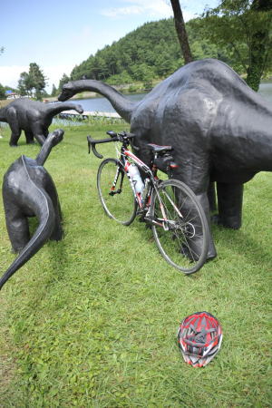 これら3体の恐竜は、大会の1週間前に製作者の西田さんが浜松市で開催中の恐竜展から引き揚げ、運んで来たものです。そして、 現場で待機していた我々(原・市川・斎藤・大西)と麻績村観光課の皆さんとで会場となる聖湖畔にセットしたものです。