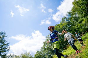 レースの方は10:00ジャスト、船木小菅村長の号砲で、大菩薩御光太鼓がドンドン鳴り響く中、一斉にスタートしました。 先ず、 選手の皆さんはワサビの棚田地帯を通り抜け、標高1300m地帯にある巨樹の森を目指します。その後、緑がまぶしいブナやミズナラの 尾根道を駆け抜け、松姫峠に到着します。ここには第1エイドがあります。
