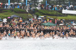 雨天と云うのに、 予想以上に出席率は良く、約500人弱の選手がスタートして行きました。毎度のことながら、浜から見るスタートシーンは圧巻です。