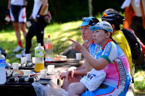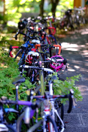 早朝5時頃にはスタート地点の川野駐車場にカラフルなウェアに身を包んだ選手たちが芸術品とも呼べる ロードバイクに跨って次から次へと集まってきます。